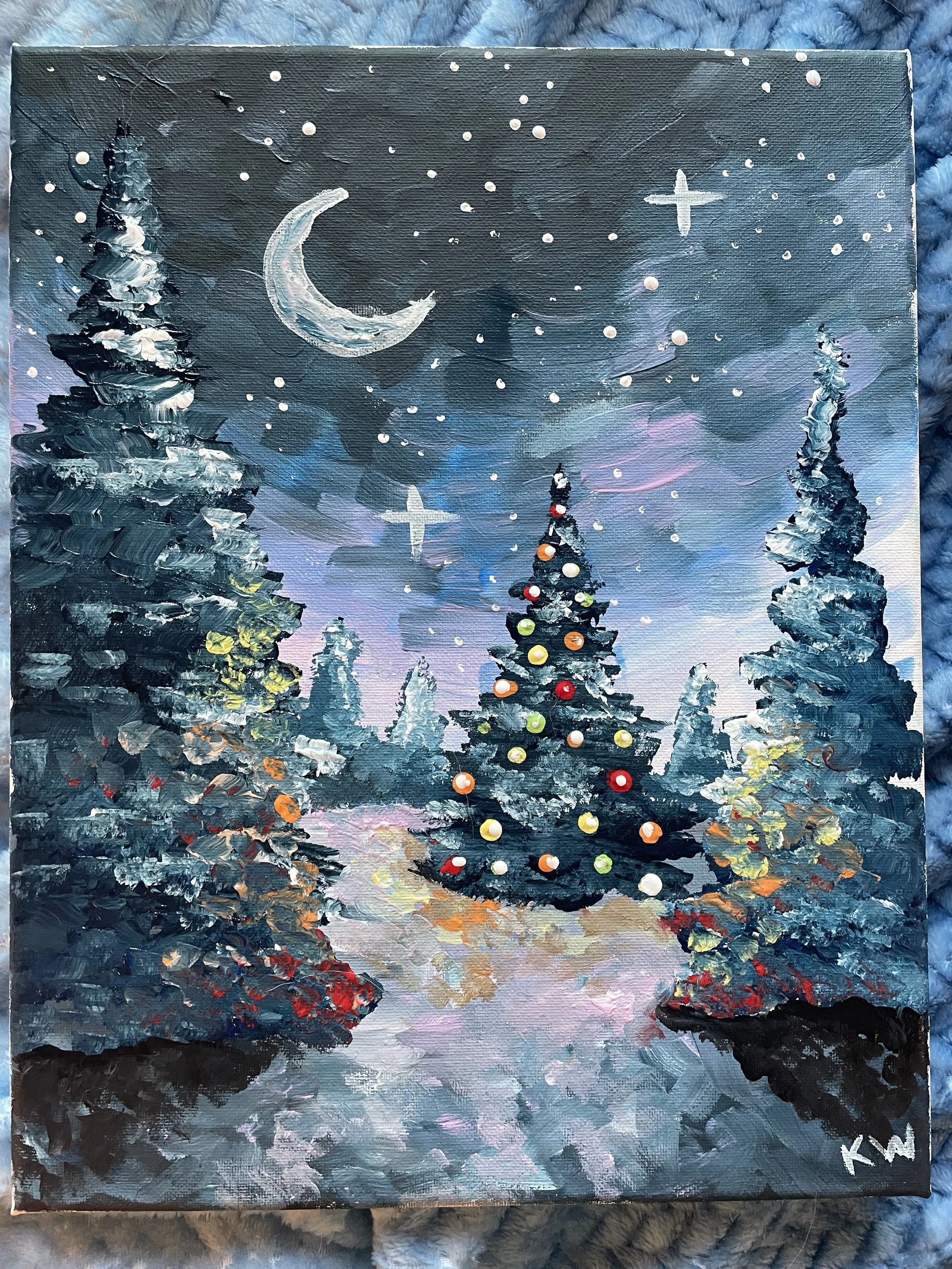 2-hour paint and sip holiday party with all supplies included and follow along instructions and cozy holiday lighting.