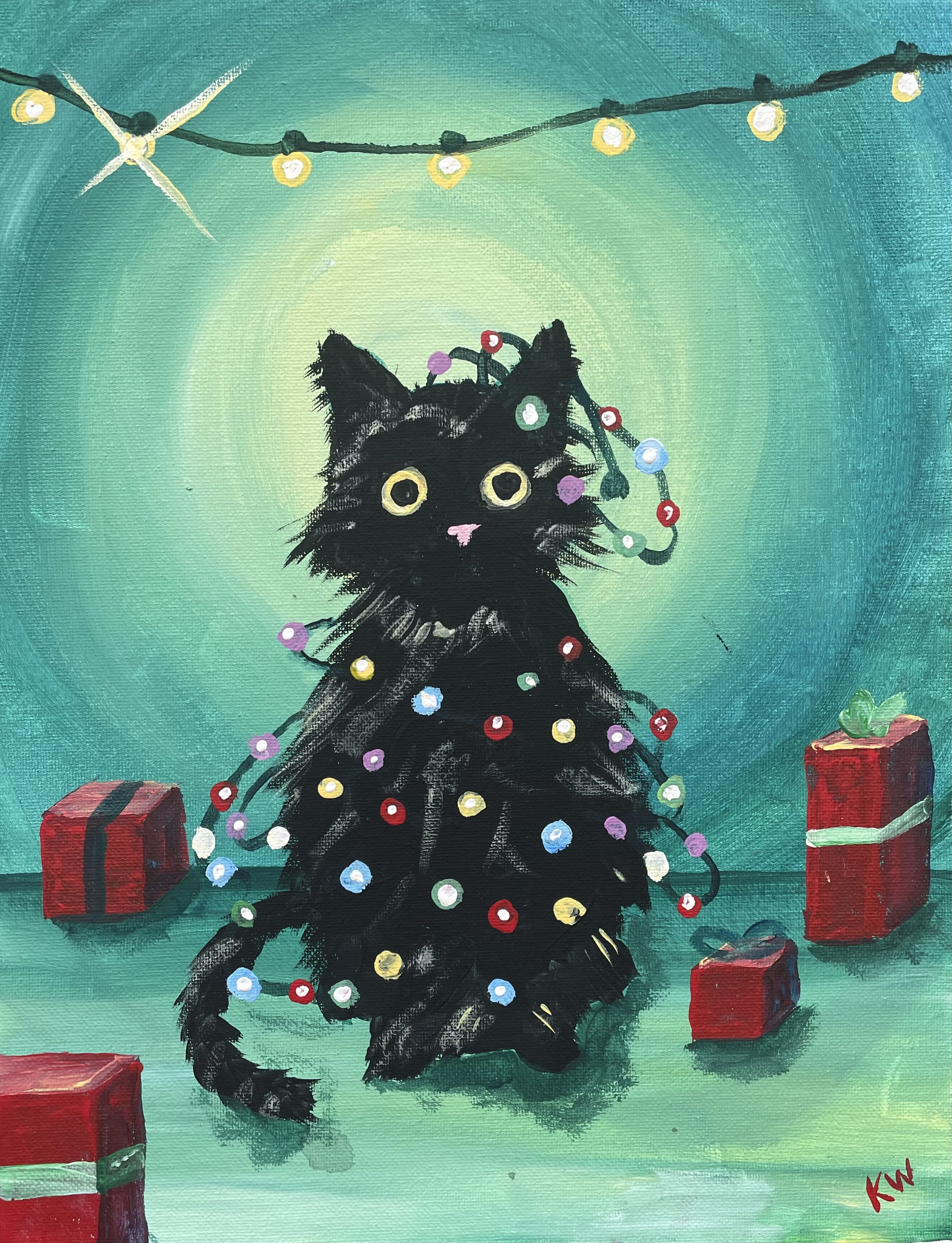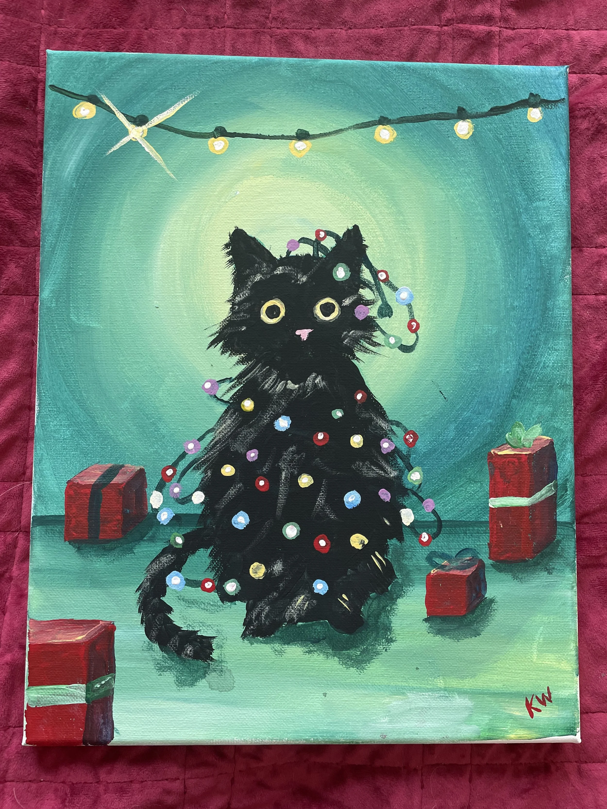 2-hour paint class with a cat Christmas Tree where we will be using real fairy lights to make the painting literally light up! (Lights provided)